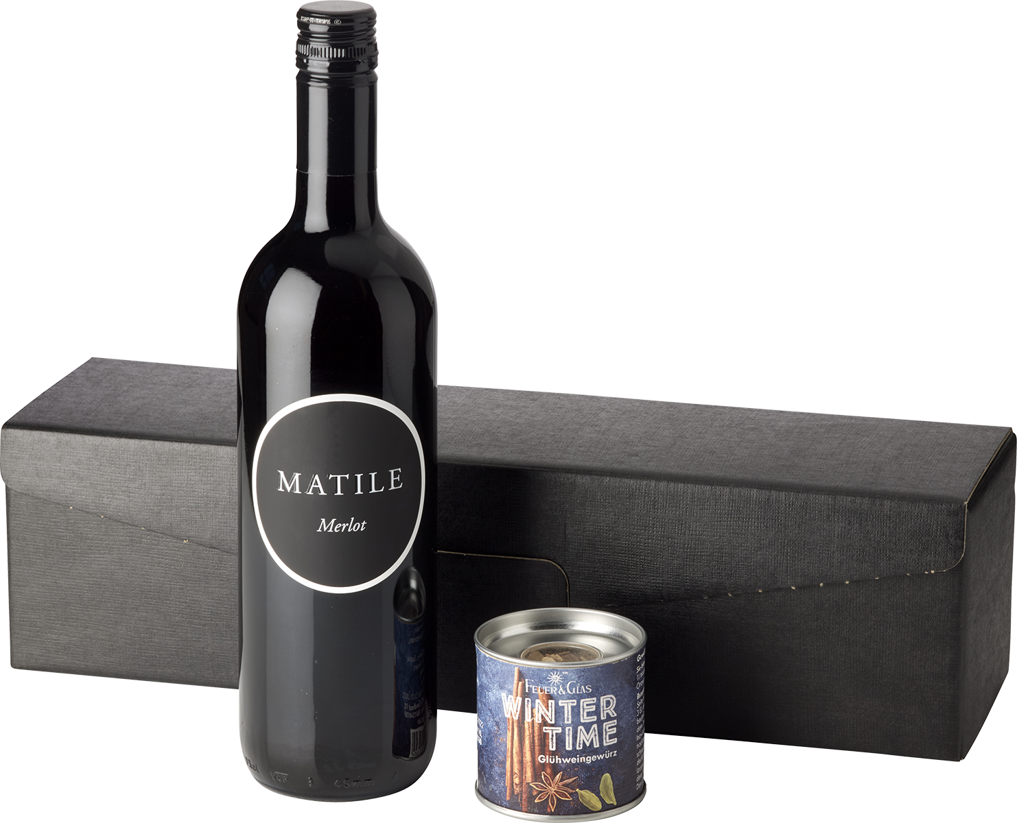 1 Flasche Matile Merlot, 0,75 l, 1 Dose Glühweingewürz 45g, verpackt im schwarzen Präsentekarton.