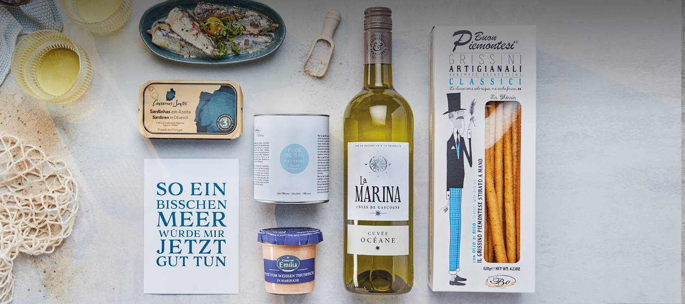 Im naturfarbenen Präsentkarton1 Flasche La Marina Cuvée Océane 0,75 l, Domaine Haut-Marin 1 Packung handgezogene Grissini Classic, 120 g1 Glas Thunfischcreme „Paté de Bonito“ 110 g 1 Dose Sardinen in Olivenöl 120 g 1 Dose Meersalz Flor de Sal Natural 180 g 1 Textkarte „So ein bisschen Meer würde mir jetzt gut tun“